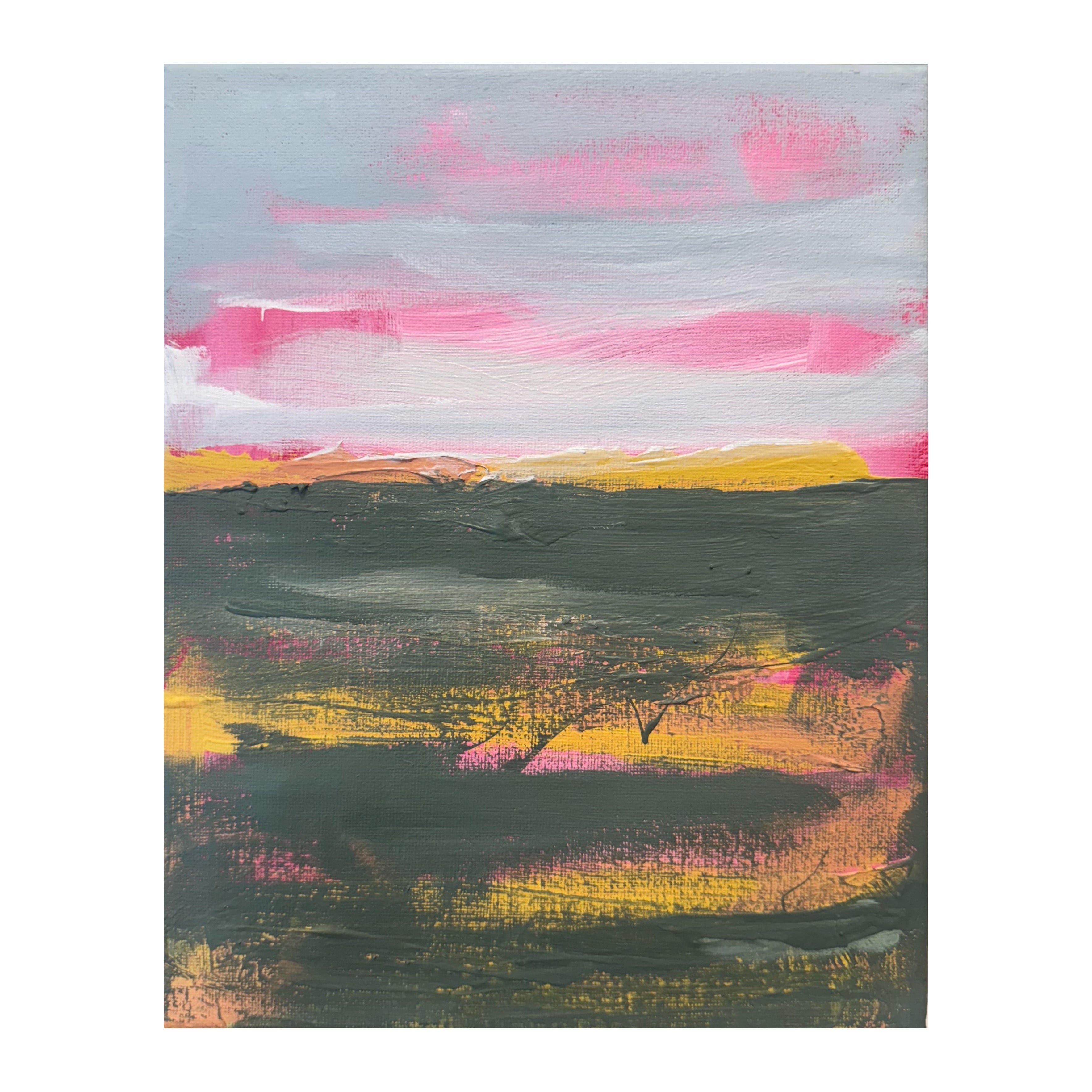 A horizon distilled to its essentials. Blush and coral drift across a muted sky, anchored by deep olive and golden undercurrents below. The color feels fleeting, like the exact five minutes when the day turns and the light becomes impossible to replicate. There’s restraint here. The brushwork is confident but pared back, allowing the surface to show through in places. It feels less like a landscape and more like a memory of one.
