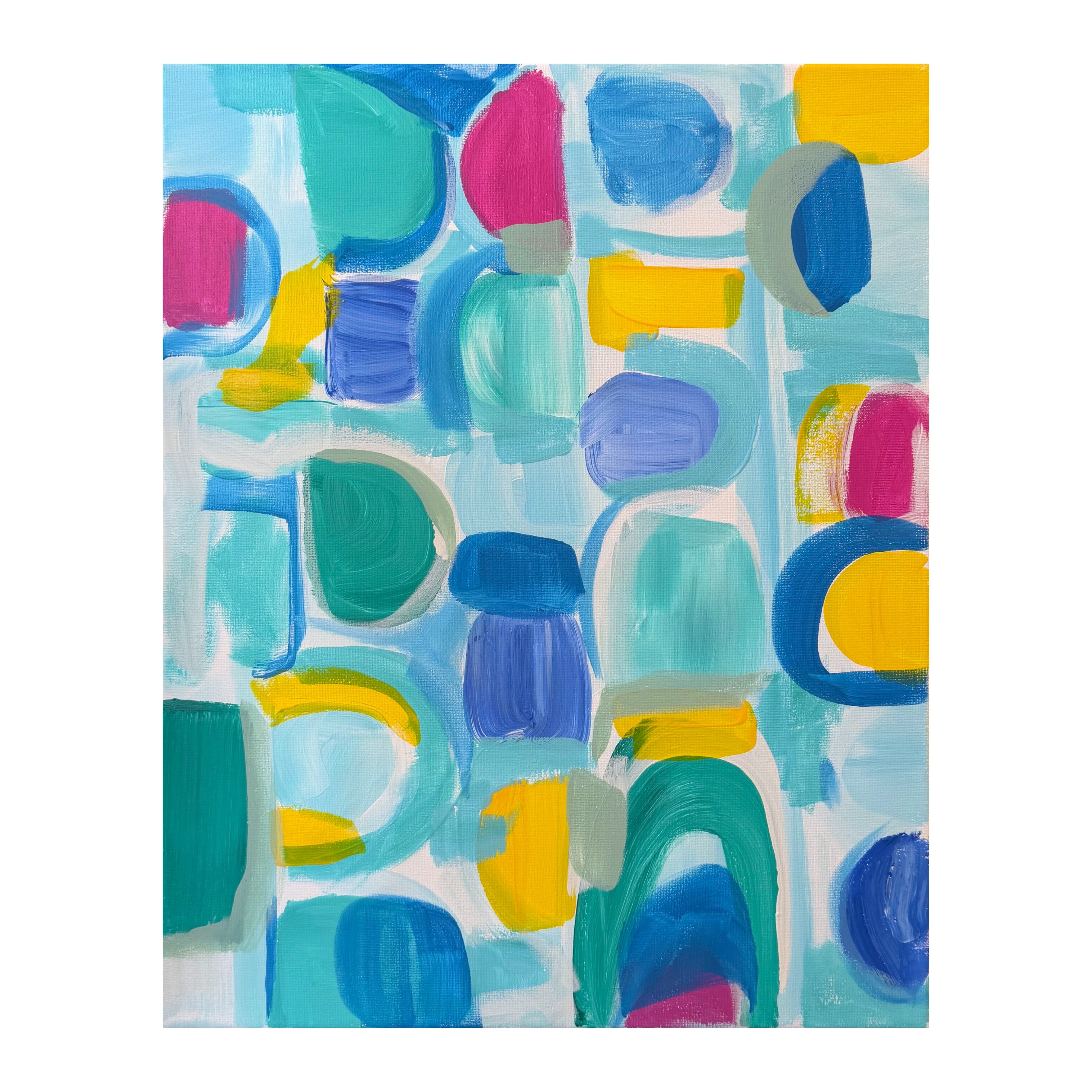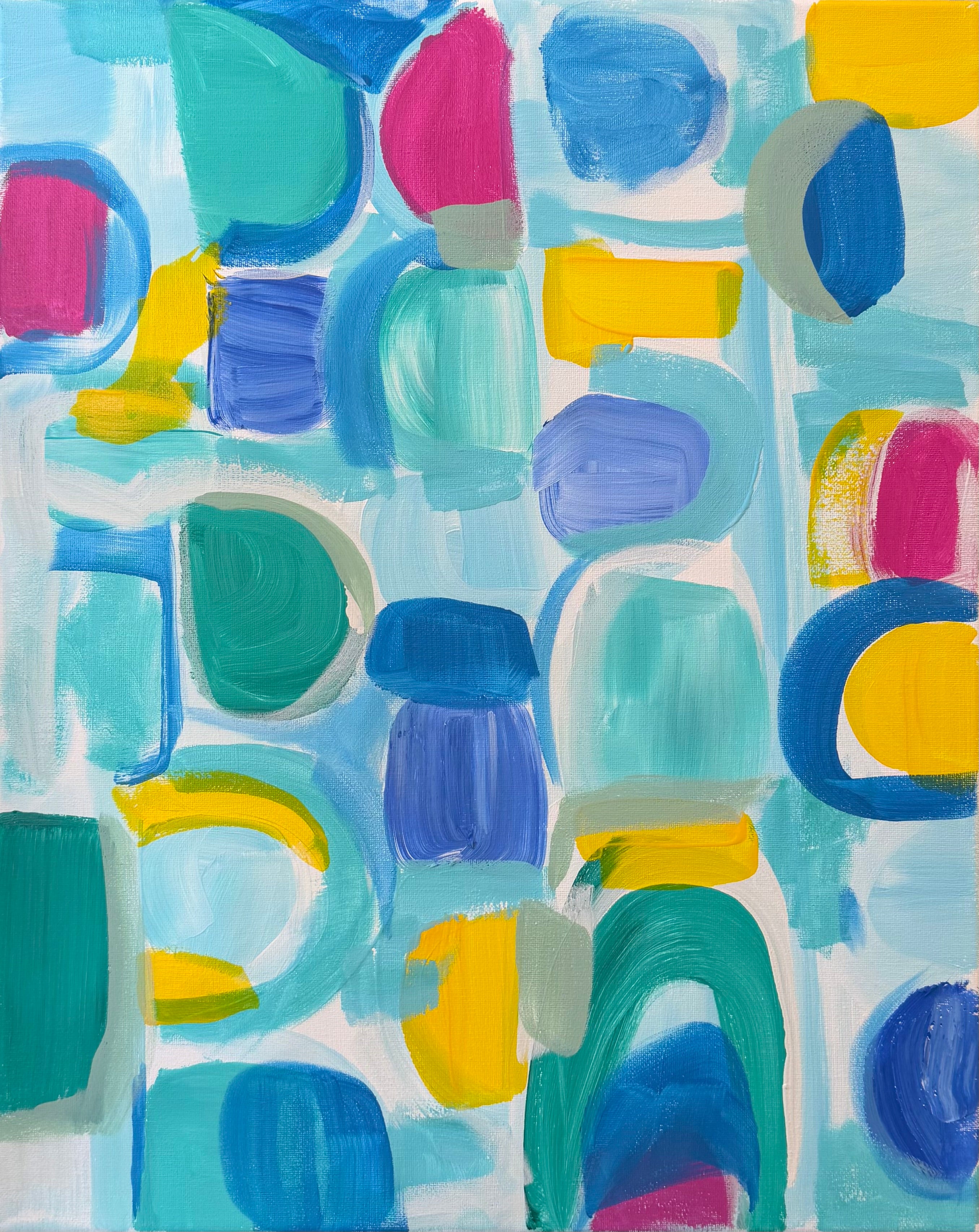 A composition built from saturated blocks and softened arcs, citron, peony, teal, and marine blue layered against a pale, airy ground. The geometry is playful, but the structure is deliberate. Every shape holds its own. There’s a sense of movement without chaos, like guests circulating through a garden at golden hour, color passing color, conversation overlapping, nothing static.