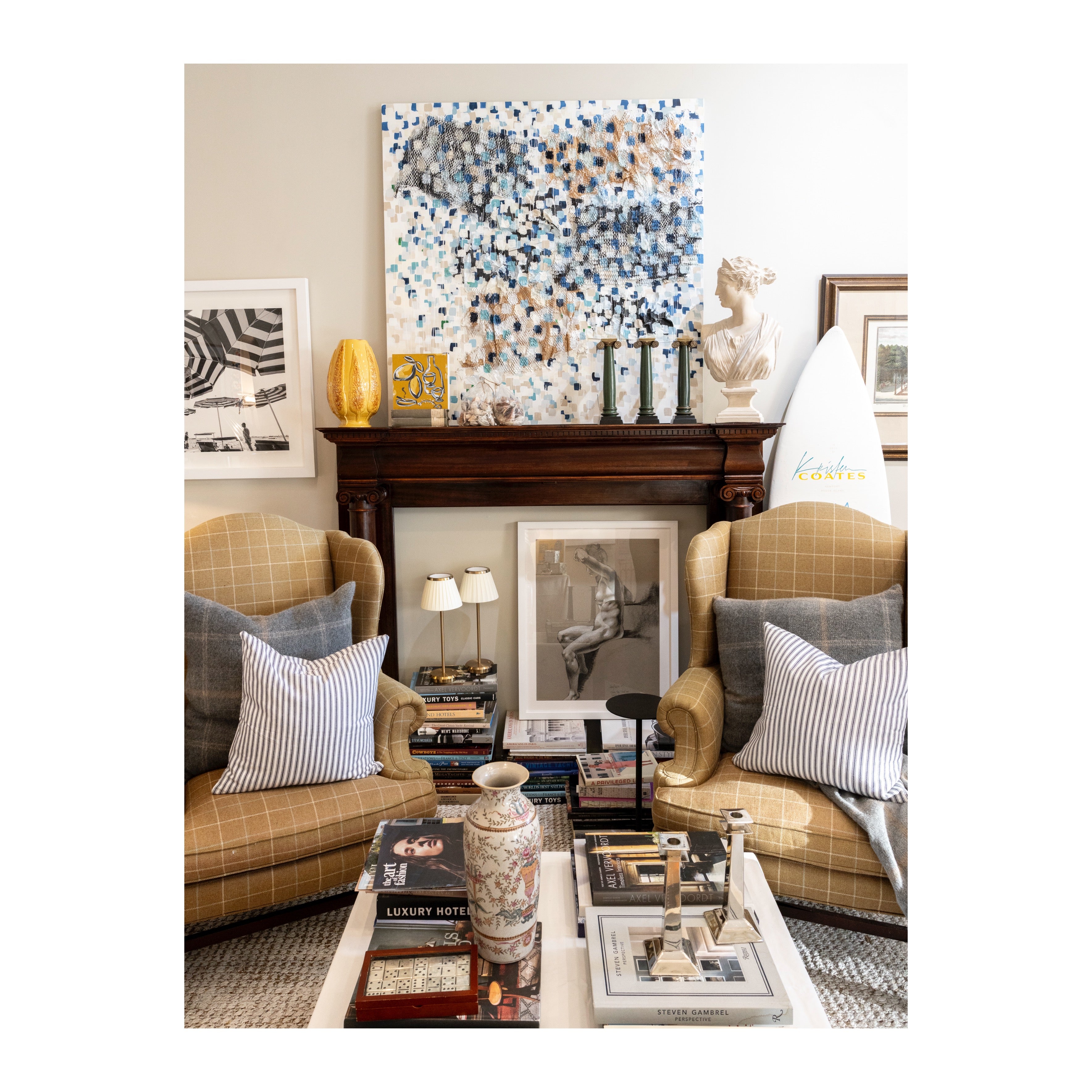 Coates is known for her painter’s eye not only in the studio, but in the way she curates physical space. She has a particular love for sourcing vintage pairs—especially chairs—and giving them new life through upholstery, placement, and story. These pieces often begin as forgotten objects and become quiet anchors in a room, shaping the way people gather, speak, and feel. In The Conversation Chairs, that transformation is on full display: what began as a functional gesture now hums with connection, character, and the gentle art of presence.