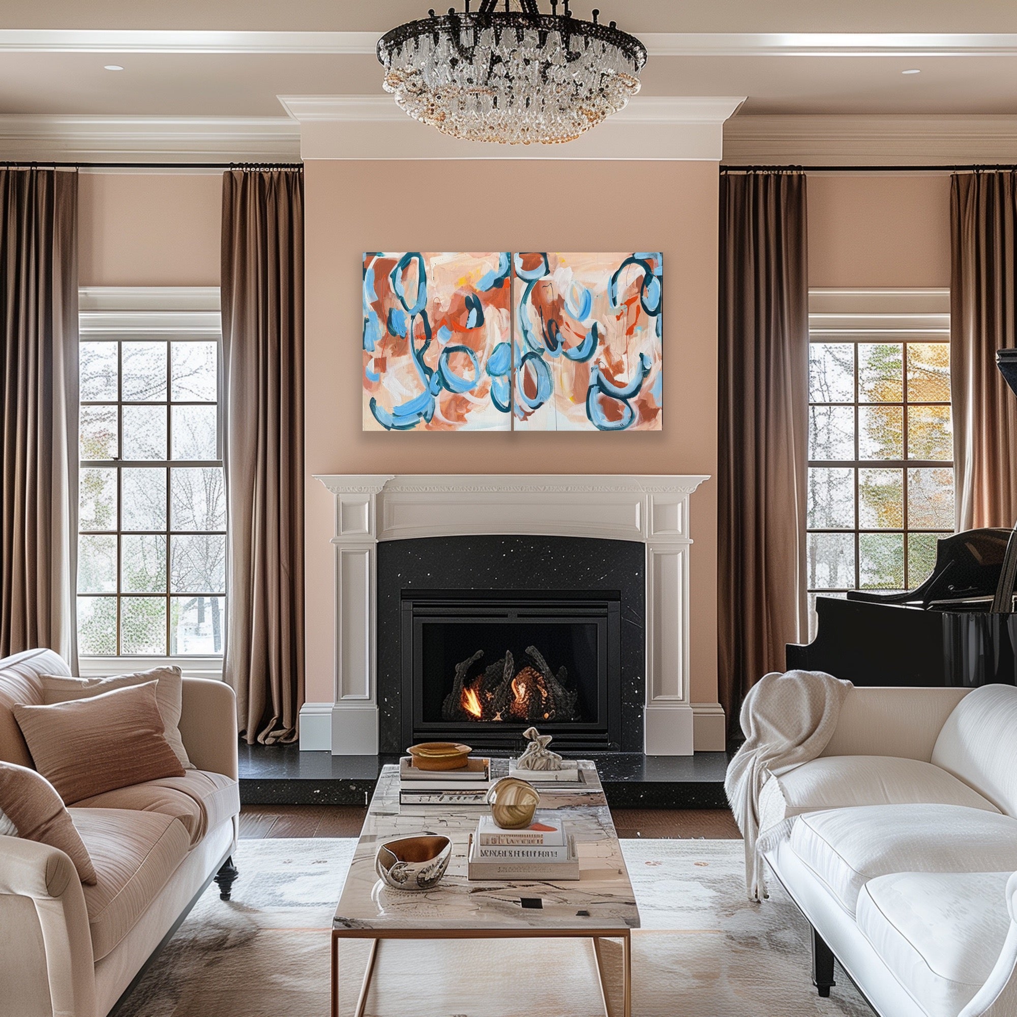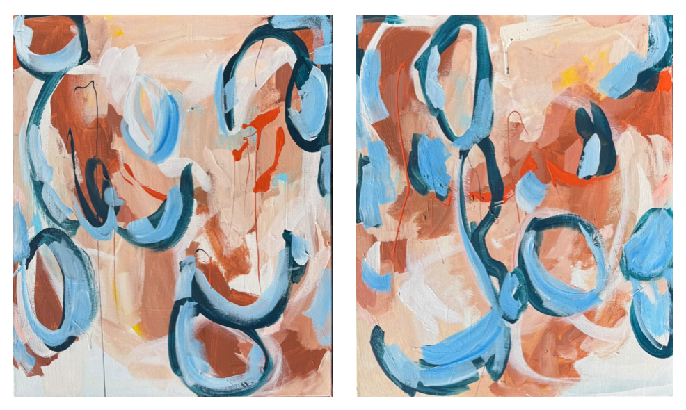One canvas gathers the color while the other allows space to open, creating a balance between density and air. Small red accents quietly connect the two compositions. Together the paintings create a conversation in movement, two distinct gestures that resolve as one.